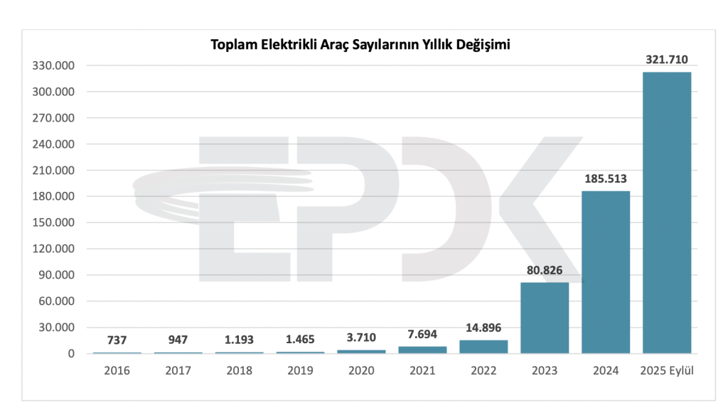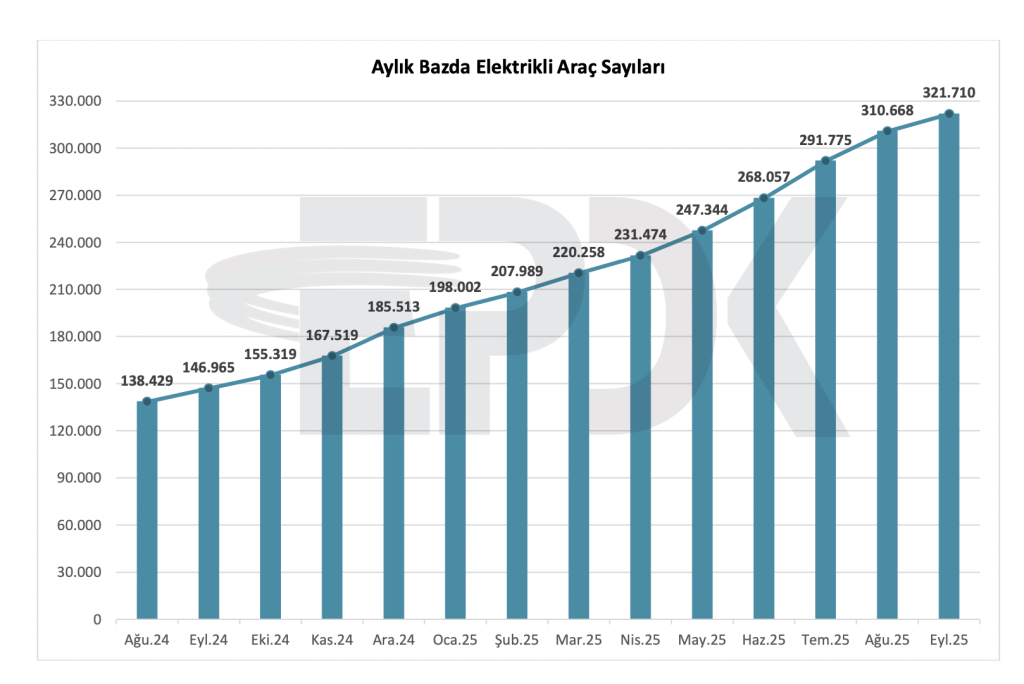 Elektrikli araç sayısı 2025 Eylül itibarıyla 321.710’a ulaşmıştır. Bu artış, bir önceki aya göre yaklaşık 11 binlik bir yükselişi göstermektedir.