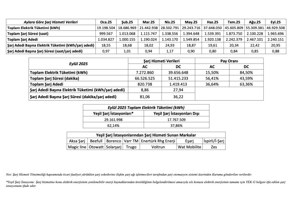 Enerji Piyasası Düzenleme Kurumu (EPDK) tarafından yayımlanan Eylül 2025 elektrikli araç ve şarj hizmeti istatistikleri, Türkiye’de e-mobilite pazarının güçlü seyrini sürdürdüğünü göstermektedir. Elektrikli araç sayısı 321.710’a yükselmiş, şarj noktası sayısı ise 35 bin sınırını aşmıştır. Hızlı şarj (DC) altyapısındaki artış devam ederken, yeşil enerjiyle çalışan şarj istasyonlarının payı %62’ye ulaşmıştır. Veriler, Türkiye’nin elektrikli ulaşımda sürdürülebilir büyüme yolunda istikrarlı ilerlediğini ortaya koymaktadır.