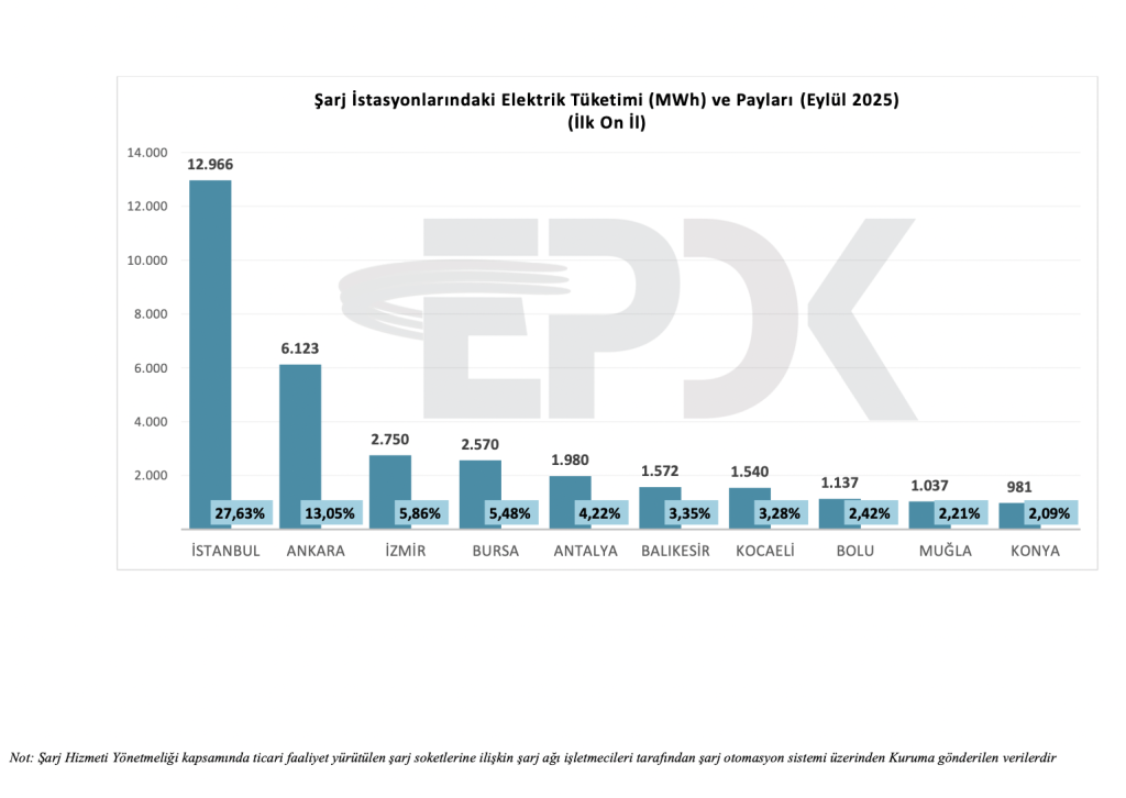 İstanbul %27,6 ile açık ara öndedir. Ankara %13,0, İzmir %5,9 pay almıştır. Büyükşehirlerde elektrikli araç kullanımı yoğunlaşmaktadır.