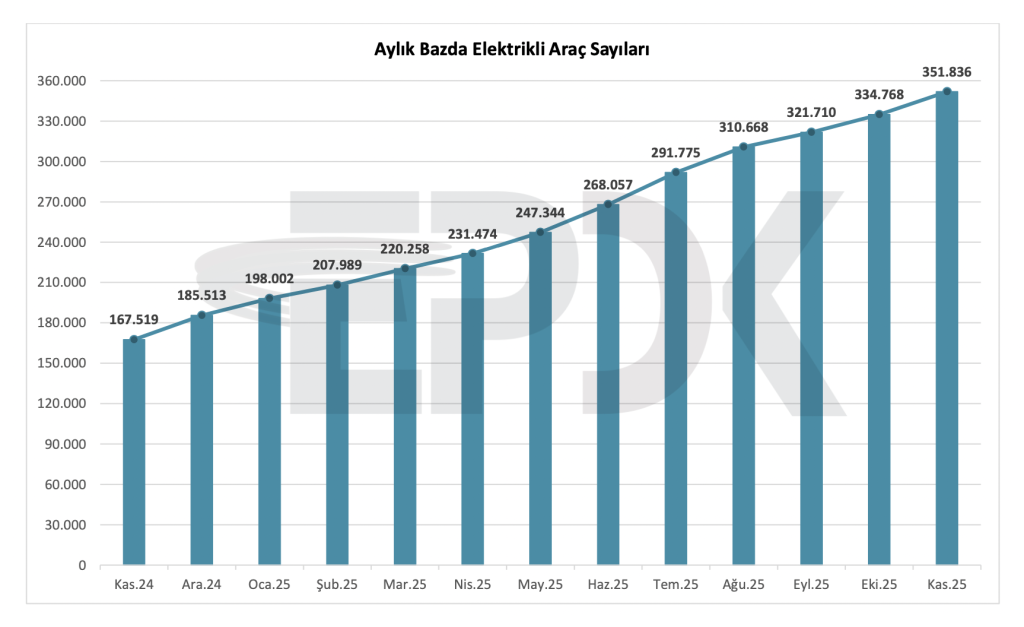 Elektrikli araç sayısı Kasım 2025 itibarıyla 351.836’ya ulaşmıştır. Bir önceki aya göre güçlü bir artış gerçekleşmiştir.