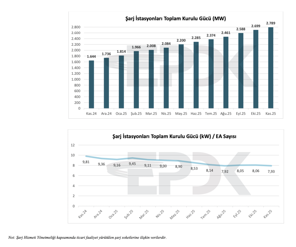 Toplam kurulu güç Kasım 2025’te 2.789 MW’a ulaşmıştır. Araç başına düşen kurulu güç ise 7,93 kW seviyesine gerilemiştir.