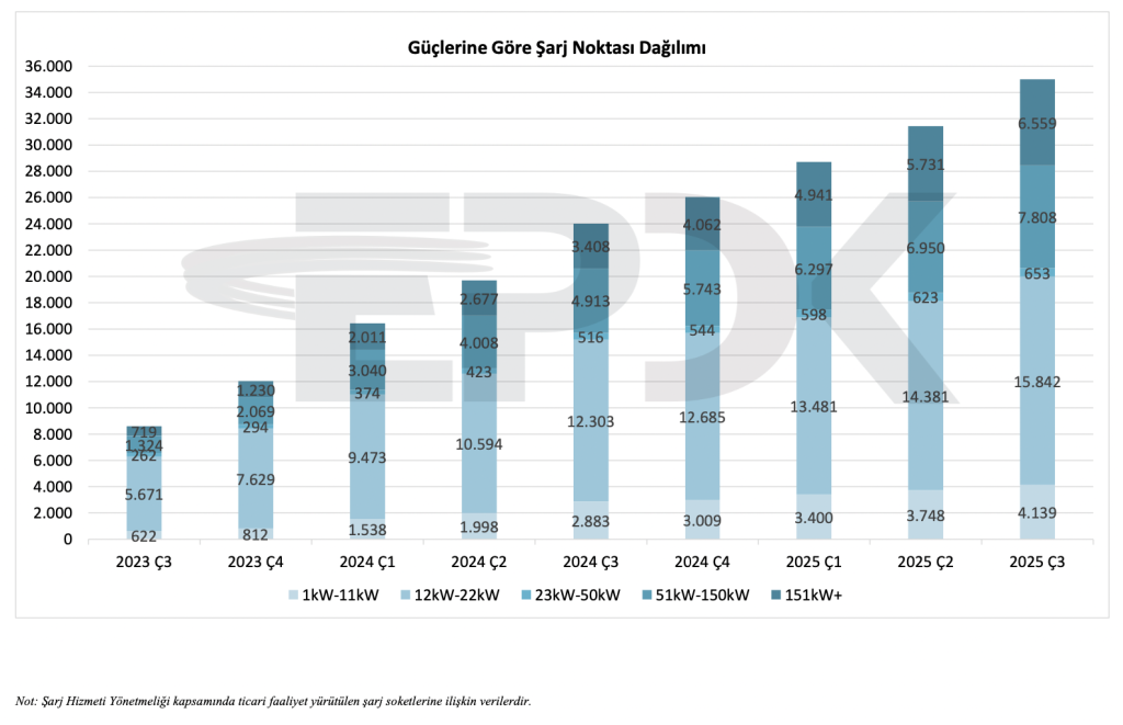 51–150 kW ve 151 kW üzeri yüksek güçlü şarj noktalarının sayısı artmıştır. Hızlı şarj altyapısına yönelik yatırımların sürdüğü görülmektedir.