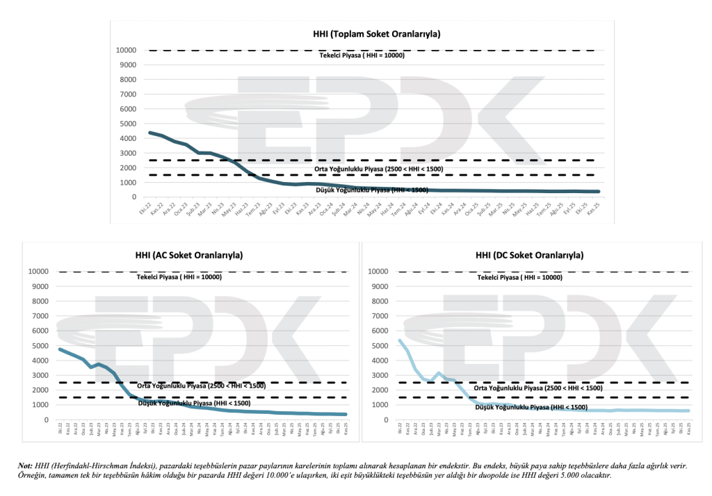 HHI endeksleri düşük–orta yoğunluk seviyesinde seyretmektedir. Piyasada belirgin bir tekelleşme eğilimi bulunmamaktadır.
