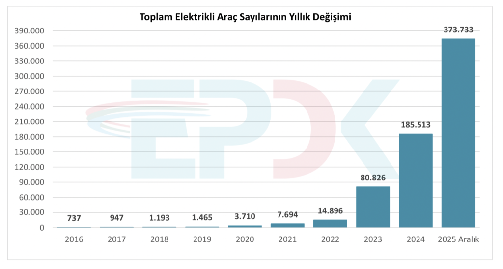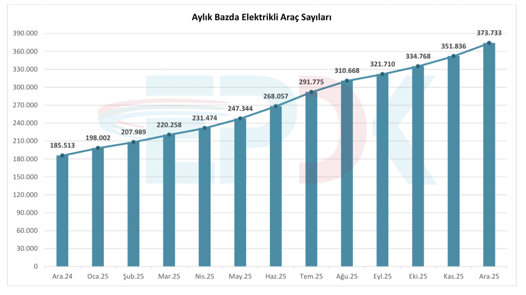 Elektrikli araç sayısı Aralık 2025 itibarıyla 373.733’e ulaşmıştır.
