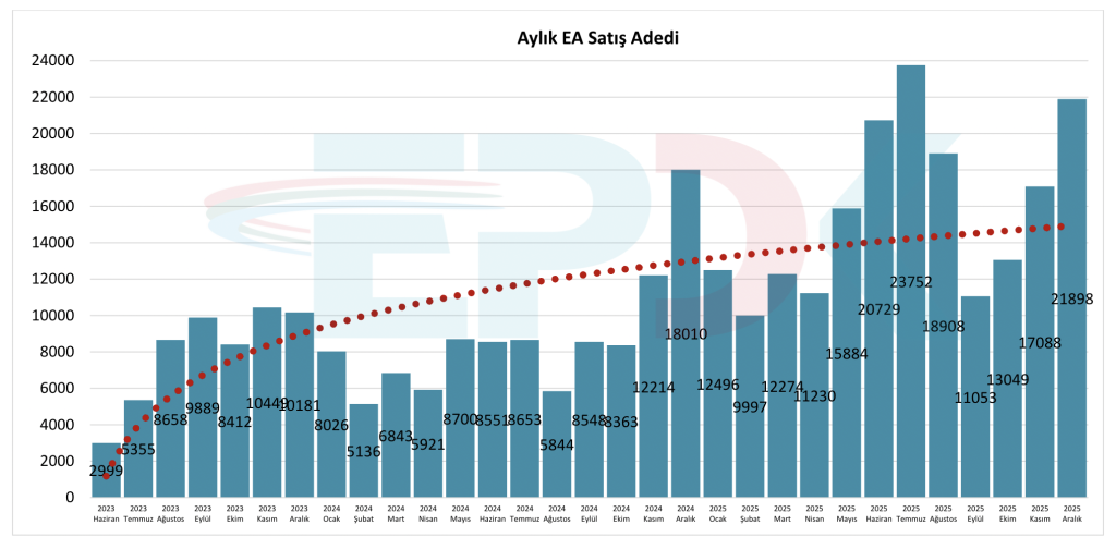 Aralık 2025’te satış adedi 21.898 olarak gerçekleşmiştir. Kasım ayına kıyasla satışlarda yeniden yükseliş görülmektedir.