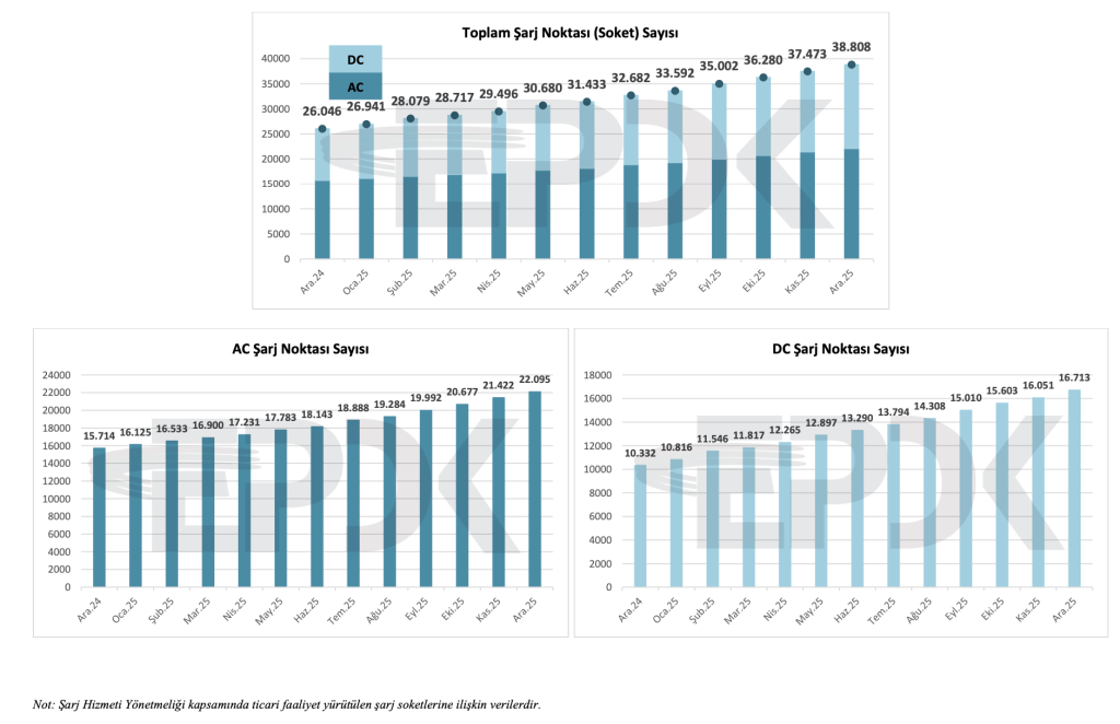 AC soket sayısı 22.095’e, DC soket sayısı ise 16.713’e yükselmiştir. DC altyapısındaki artış dikkat çekmektedir.