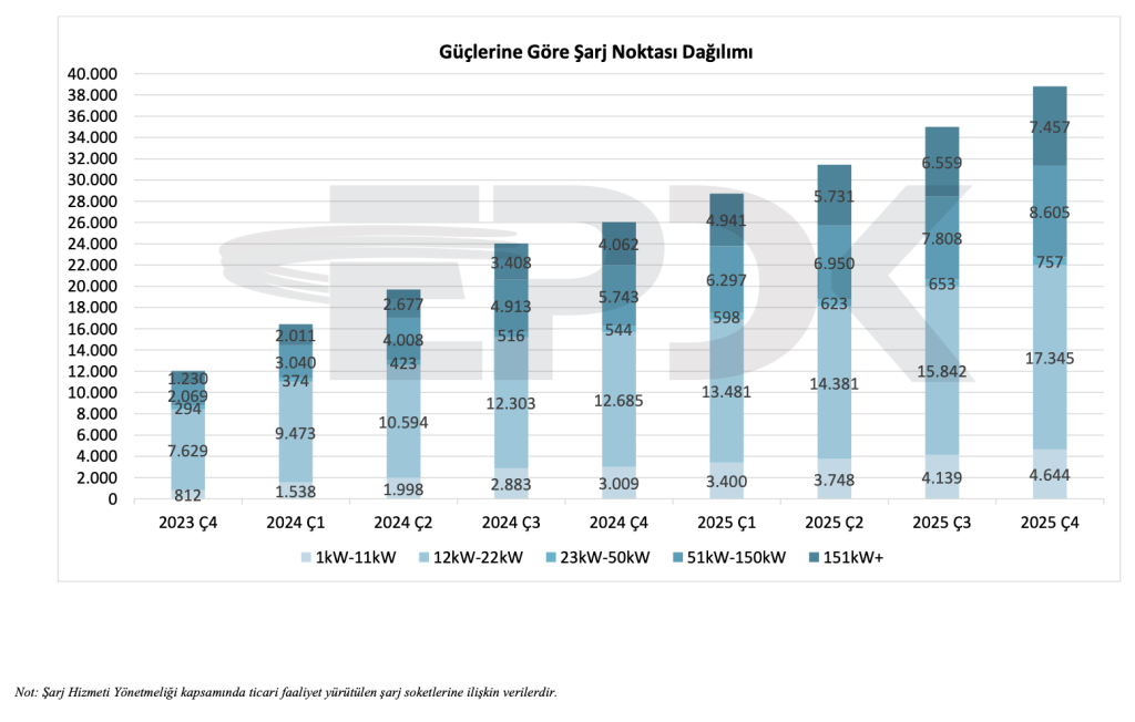 51–150 kW ve 151 kW üzeri yüksek güçlü şarj noktalarında belirgin artış görülmektedir. Bu durum, hızlı şarj altyapısına yapılan yatırımların güçlendiğini göstermektedir.