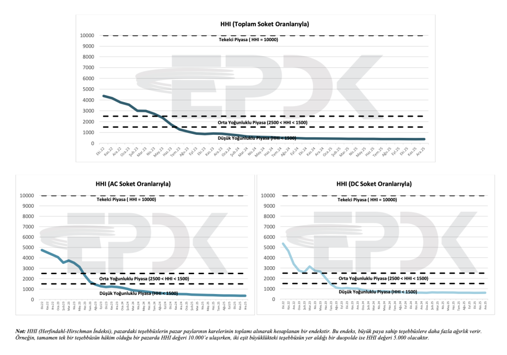 HHI değerleri toplam, AC ve DC soket oranlarında düşüş eğilimi göstermektedir. Piyasa düşük yoğunluk seviyesine yaklaşmakta olup belirgin bir tekelleşme riski görülmemektedir.