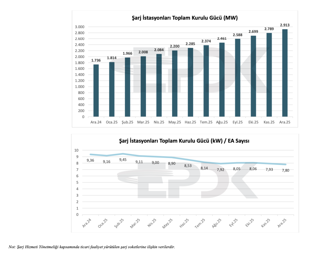 Toplam kurulu güç Kasım 2025’te 2.913 MW’a ulaşmıştır. Araç başına düşen kurulu güç ise 7,80 kW seviyesine gerilemiştir.